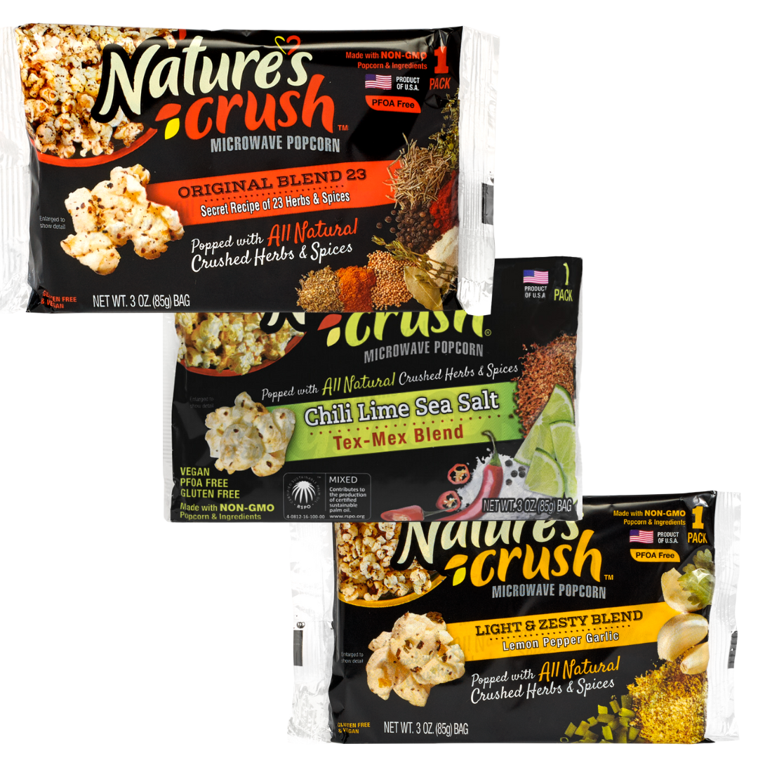 Can't decide which flavor to try first? Now you can try all three Nature's Crush flavors with our variety bundle. Included in the bundle is two bags of each flavor: Original 23; Tex-Mex; and Light & Zesty.
